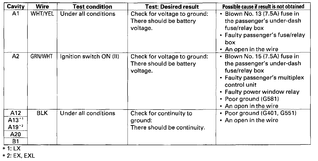 NOTE: For the terminals A4, A5 (LX), A10 A11, A13 (EX,EXL), and AU, refer to the power window control unit input test.