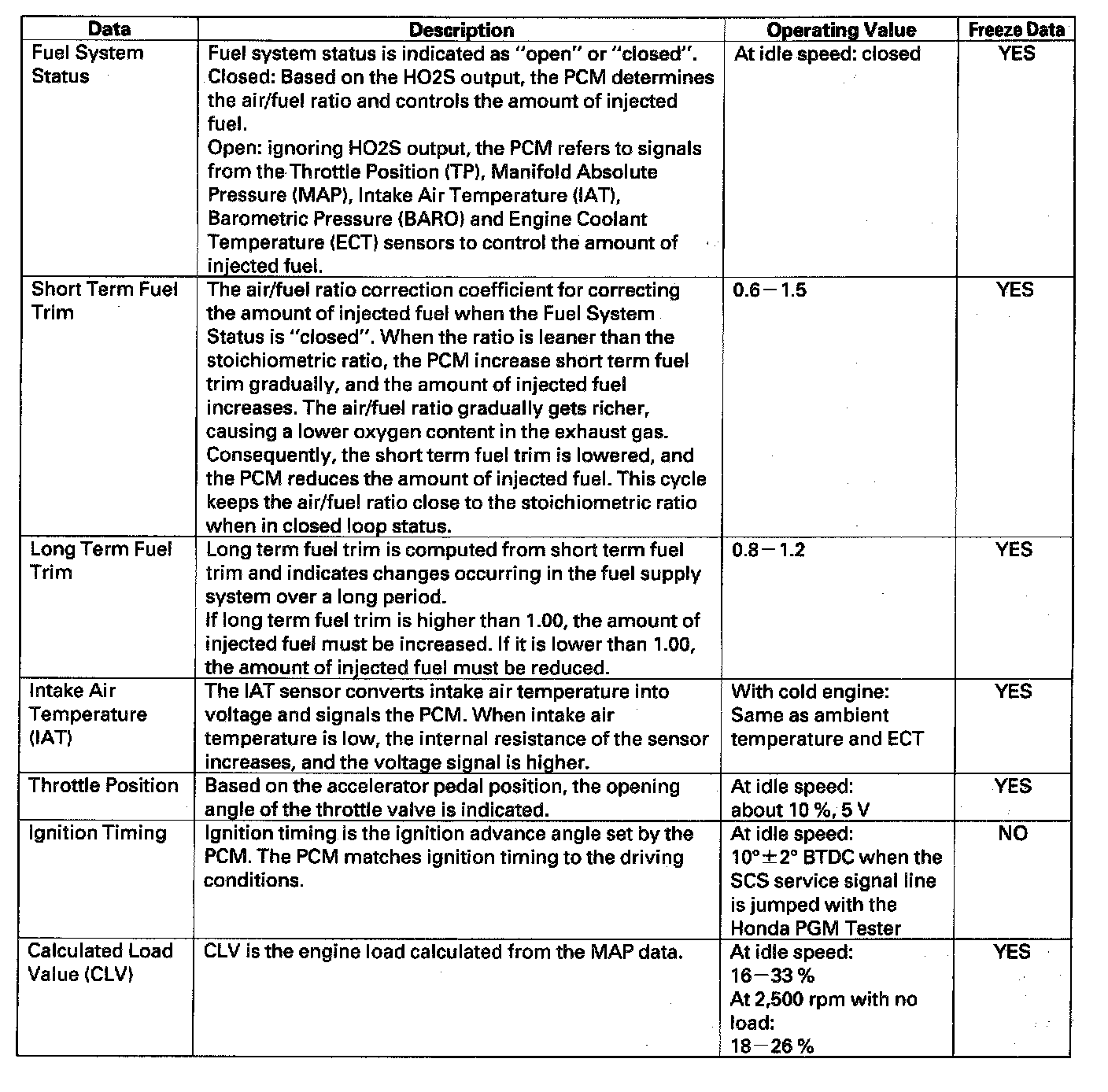 PCM DataYou can retrieve data from the PCM by connecting the OBD II scan tool or the Honda PGM Tester to the Data Link Connector (DLC). The items listed in the table below conform to SAE recommended practice. The Honda PGM Tester also reads data beyond that recommended by SAE. Understanding this data may help you find the causes of intermittent problems.
