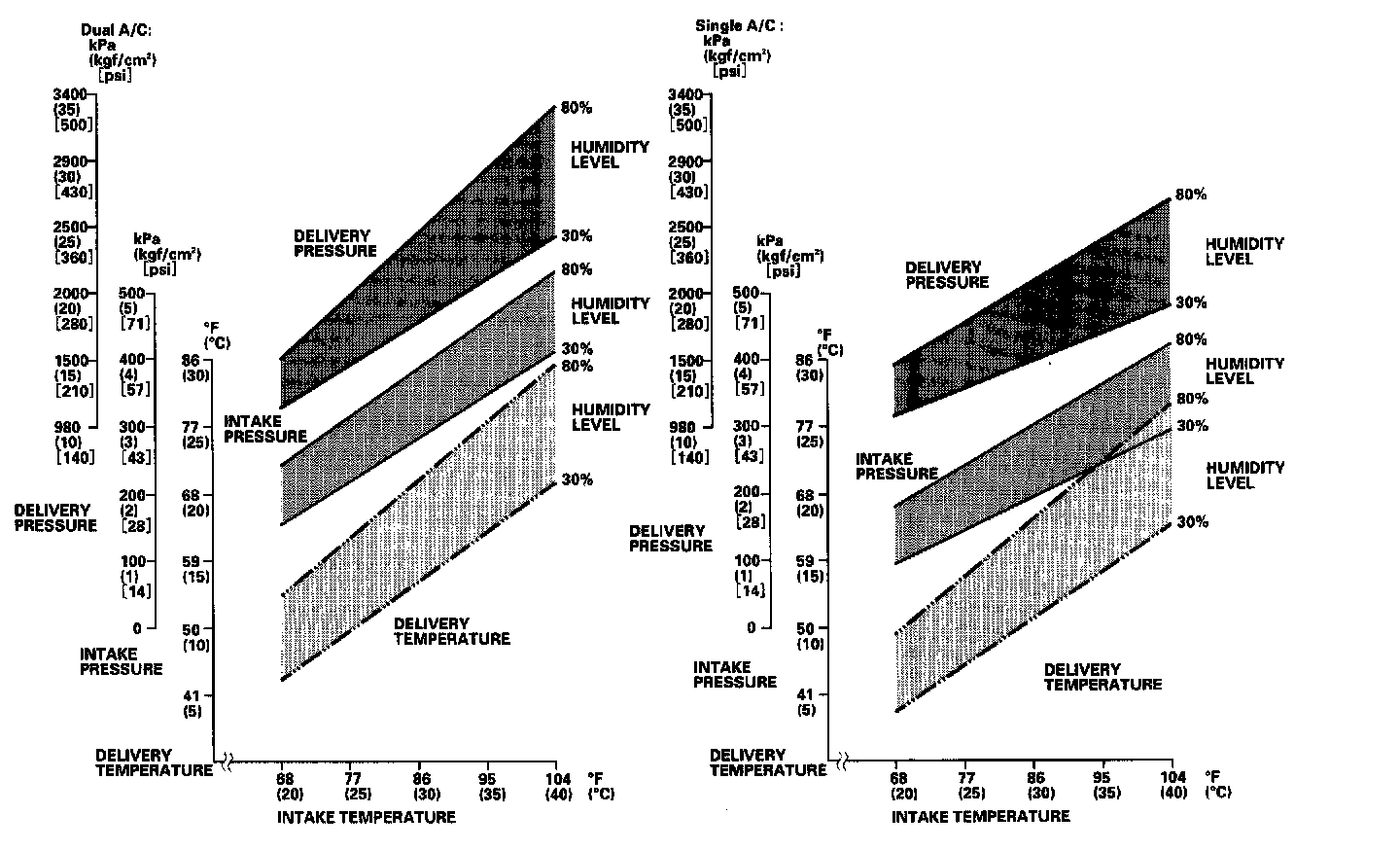 5. After running the air conditioning for 10 minutes under the above test conditions, read the delivery temperature from the thermometer in the dash vent, the intake temperature near the blower unit behind the glove box and the high and low system pressure from the A/C gauges.