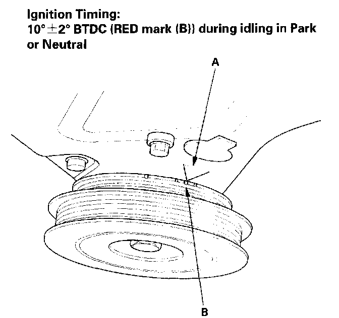 6. Aim the light toward the pointer (A) on the timing belt cover. Check the ignition timing under a no load conditions: headlights, blower fan, rear window defogger, and air conditioner are not operating. If the ignition timing differs from the specification given, check the cam timing, and the top dead center (TDC) and crankshaft position (CKP) sensors. If necessary, substitute a known-good powertrain control module (PCM) and recheck.