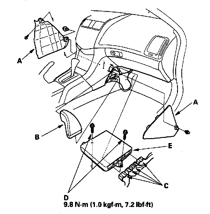 5. Remove the bolts (D), then remove the ECM/PCM (E).