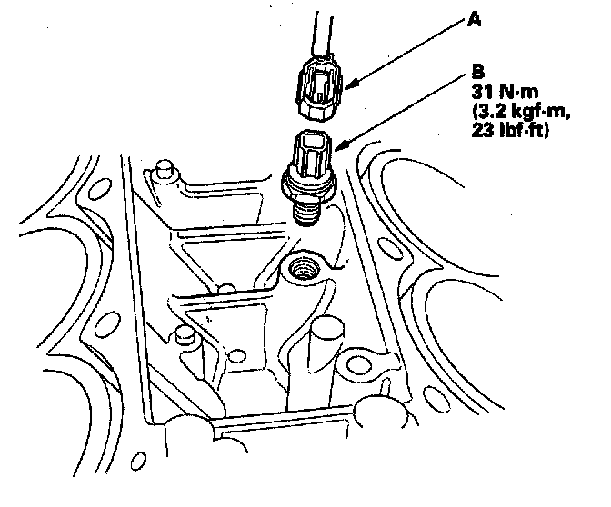 3. Disconnect the knock sensor connector (A), then remove the knock sensor (B).