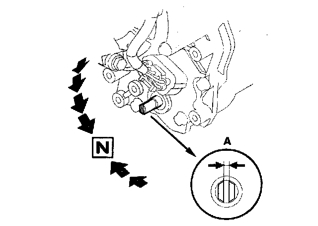 7. Align the cutouts (A) on the rotary-frame with the neutral positioning cutouts (B) on the transmission range switch (C), then put a 2.0 mm (0.08 inch) feeler gauge blade (D) in the cutouts to hold the switch in the N position.