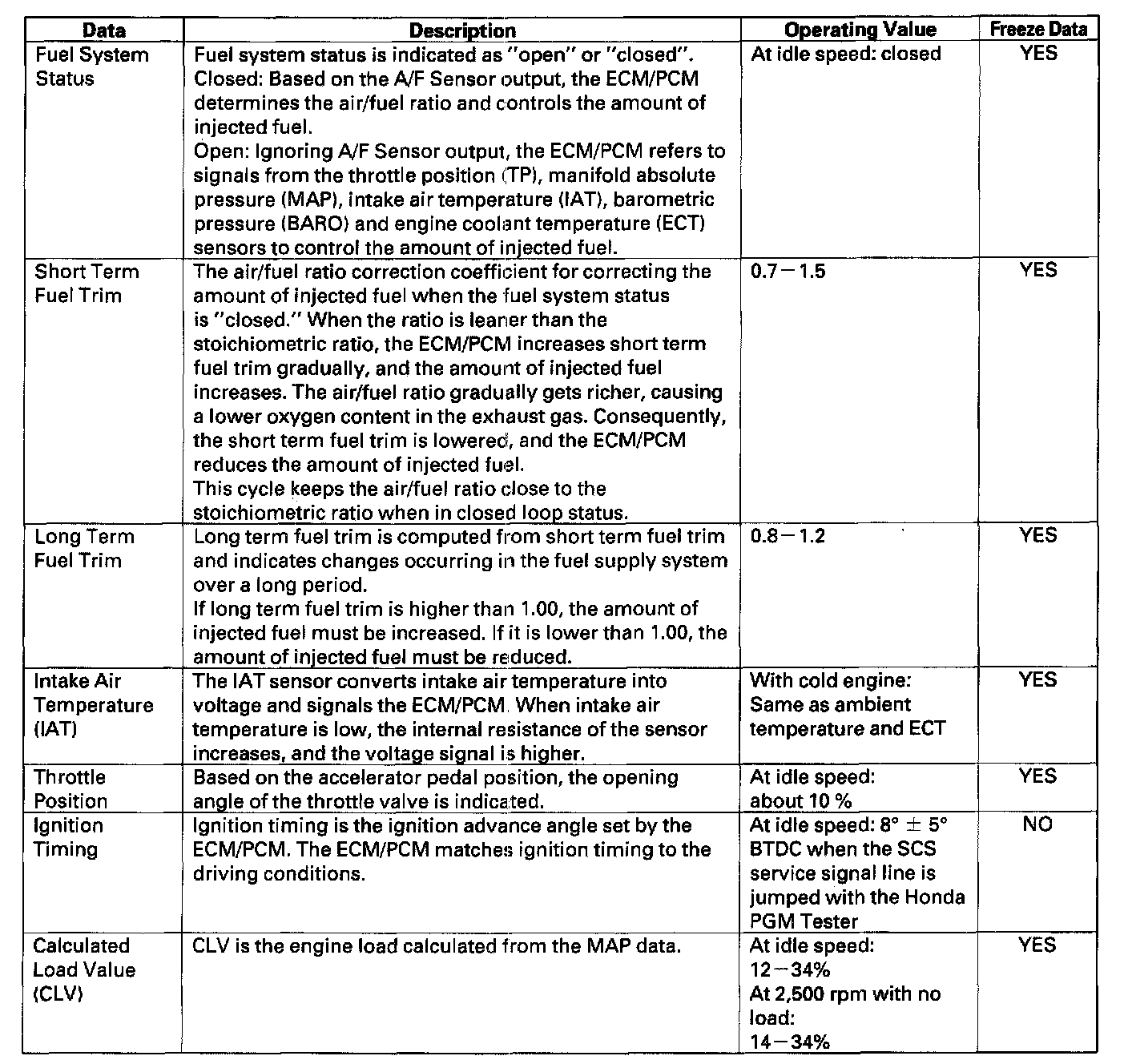 You can retrieve data from the ECM/PCM by connecting the OBD II scan tool or the Honda PGM Tester to the data link connector (DLC). The items listed in the table above conform to SAE recommended practice. The Honda PGM Tester also reads data beyond that recommended by SAE to help you find the causes of intermittent problems.