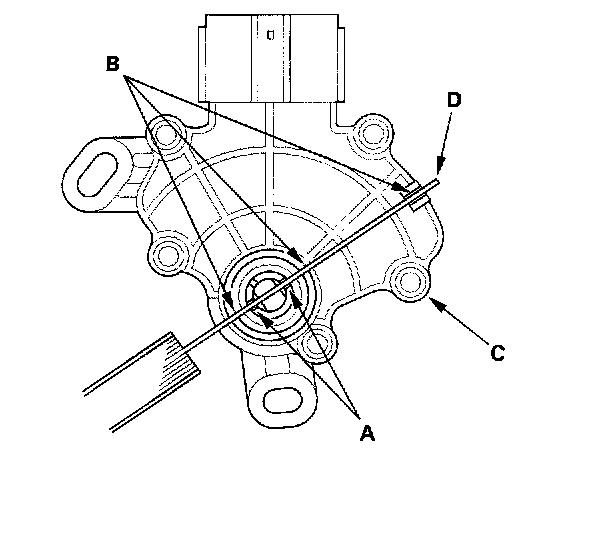 7. Align the cutout (A) on the rotary-frame with the neutral positioning cutouts (B) on the transmission range switch (C), then put a 2.0 mm (0.08 inch) feeler gauge blade (D) in the cutouts to hold it in the position.