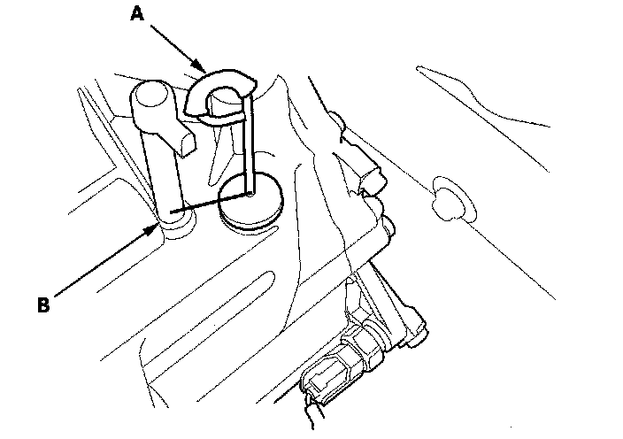 8. Insert the dipstick (A) back into the transmission with the handle pointing toward the breather pipe (B).