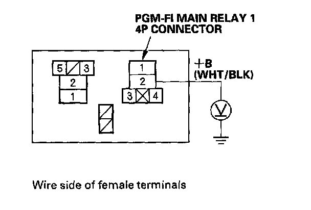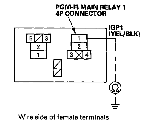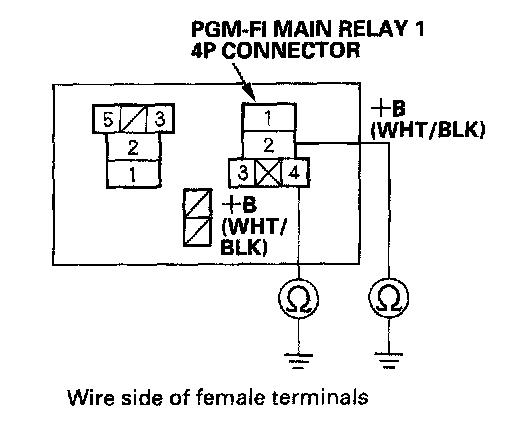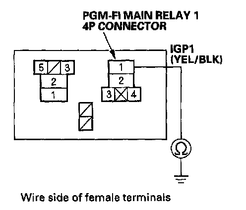 32. Disconnect each of the components or connectors below, one at a time, and check for continuity between PGM-FI main relay 1 4P connector terminal No.1 and body ground.
