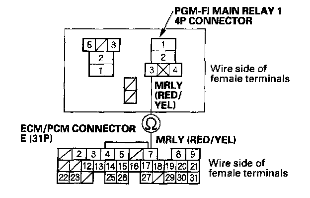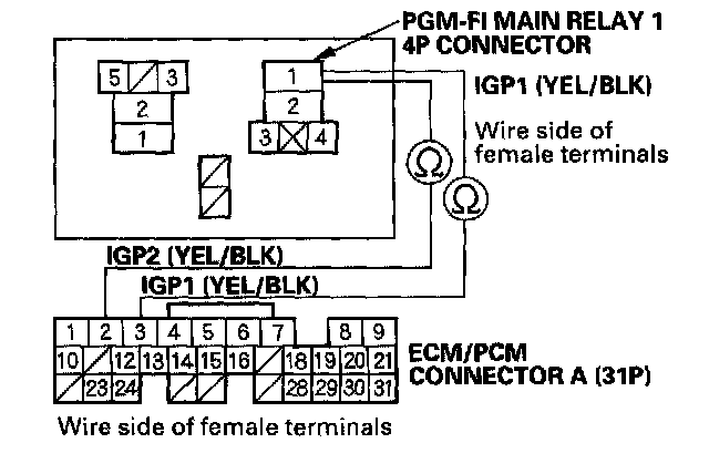 31. Check for continuity between body ground and PGM-FI main relay 1 4P connector terminals No.2 and No.4 individually,