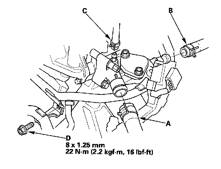 3. Remove the upper radiator hose (A), heater hose (B), water bypass hose (C) and connecting pipe mounting bolt (D).