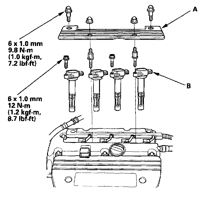 cover (A), then remove the ignition coils (B).