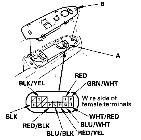 2. Disconnect the 13P connector (A) from the power mirror switch (B).