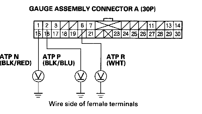 2. If the MIL does not come on, and the A/T gear position indicator P, N, or R does not come on, remove the gauge assembly from the dashboard, then disconnect gauge assembly connector A (30P).