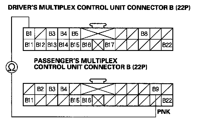 3. Check for continuity between No.1 terminal of the driver's multiplex connector B (22P) and No.9 terminal of the passenger's multiplex connector B (22P).