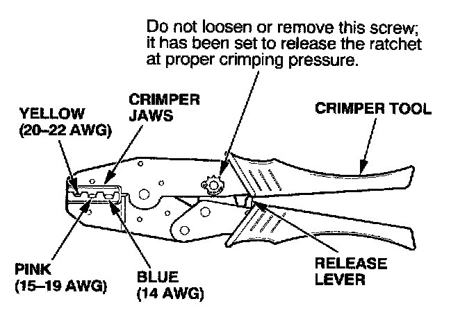 8. Put the splice connector in the proper size slot in the Crimper Tool, slide it to one end (where the flare begins), and close the crimper; handles far enough to hold it in place. To release the ratchet mechanism at any point after the first click, squeeze the handles slightly and push the release lever, then let the handles open.