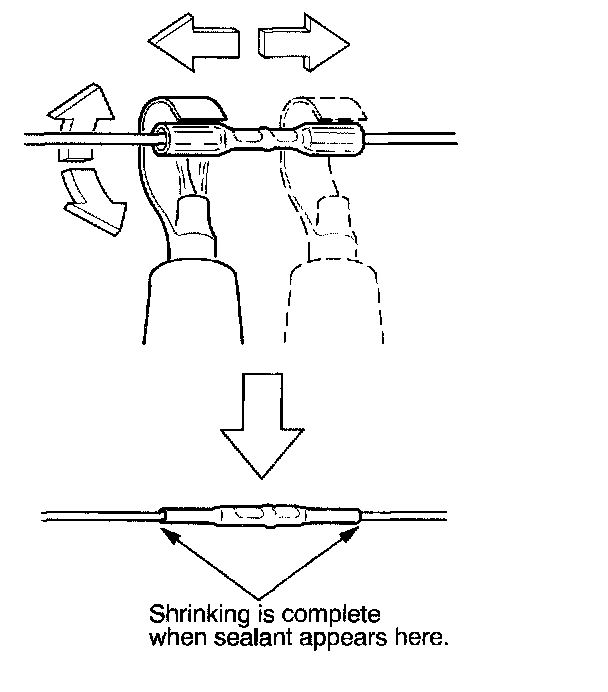 13. Plug in the heat gun, and turn it on. Start at the middle of the splice connector, and move the gun toward the ends as the tube shrinks. Apply heat evenly by rotating the curved heat spreader around the splice connector. Shrinking is complete when a small amount of sealant appears at each end of the tube.