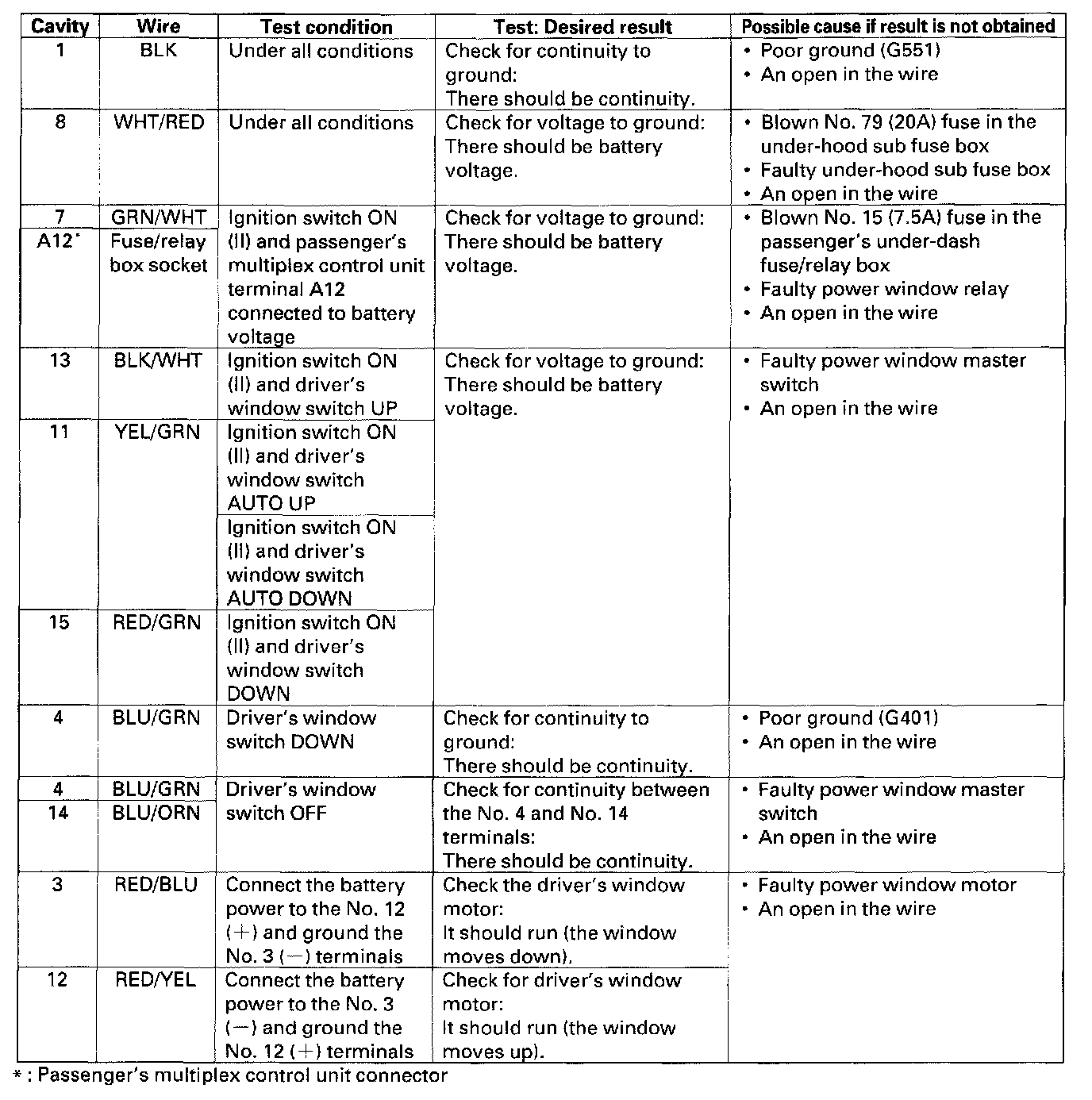 5. Reconnect the 18P connector to the power window control unit, and reconnect the passenger's multiplex control unit. Then make these input tests at the connector.
