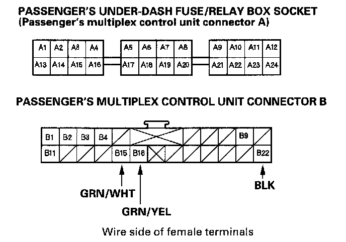 8. With the passenger's multiplex control unit still disconnected, make these input tests at the connector and the fuse/relay box socket.