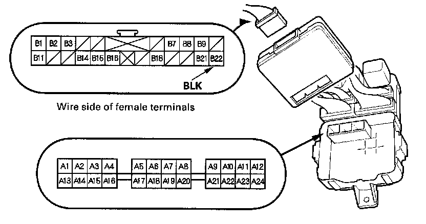 10. Make the following input tests at 22P connector Band the driver's under-dash fuse/relay box socket connector A. Be careful not to spread the fuse box connectors.