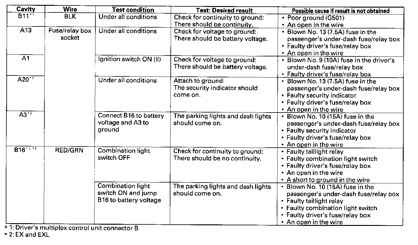 9. Reconnect the passenger's multiplex control unit to the passenger's under-dash fuse/relay box, and perform the following input tests at the appropriate connectors on the passenger's under-dash fuse/relay box.