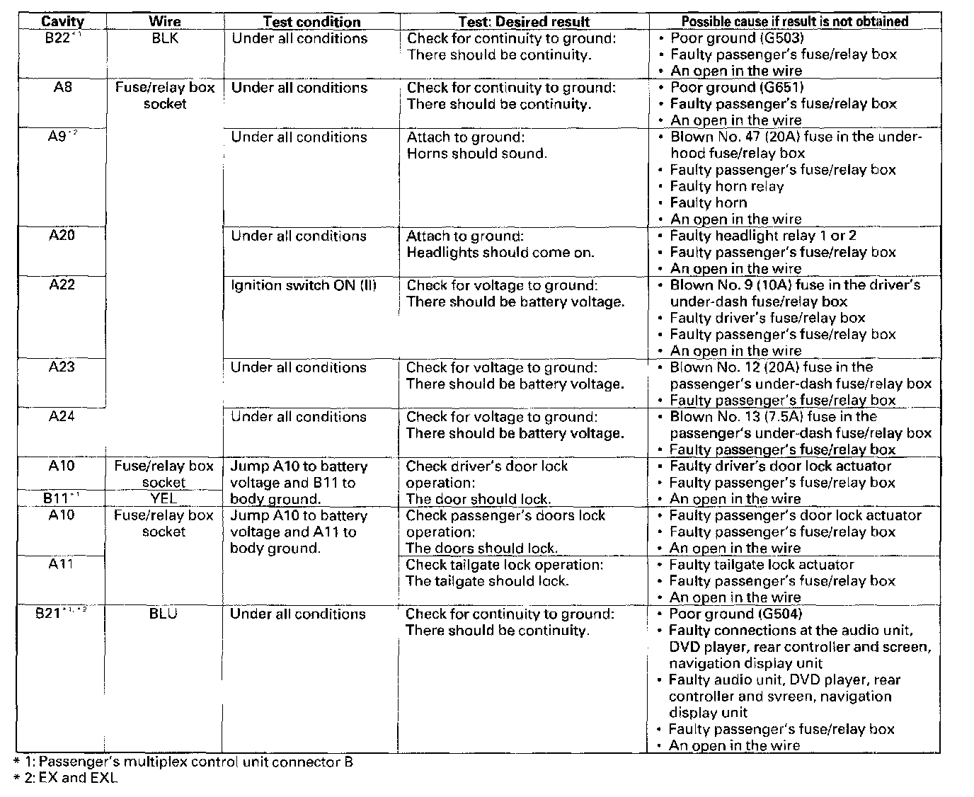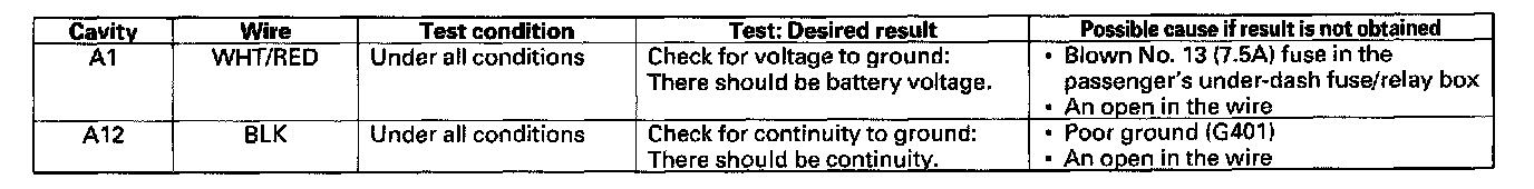 8. With the passenger's multiplex control unit still disconnected make these input tests at the connectors and the passenger's under dash fuse/relay box sockets
