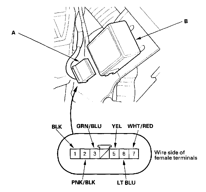 2. Disconnect the 7P connector (A) from the keyless receiver unit (B).