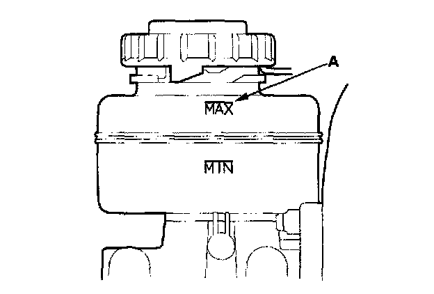 1. Make sure the brake fluid level in the reservoir is at the MAX (upper) level line (A).