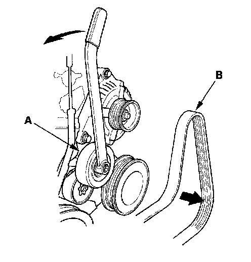 Move the auto-tensioner (A) to relieve tension from the alternator-compressor belt (B), and remove the belt.