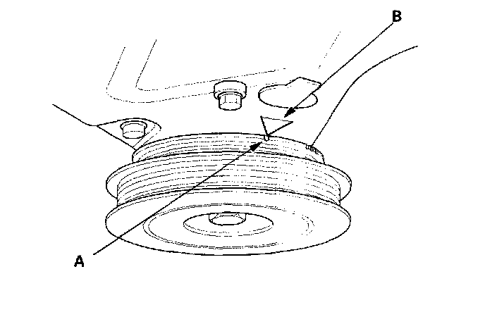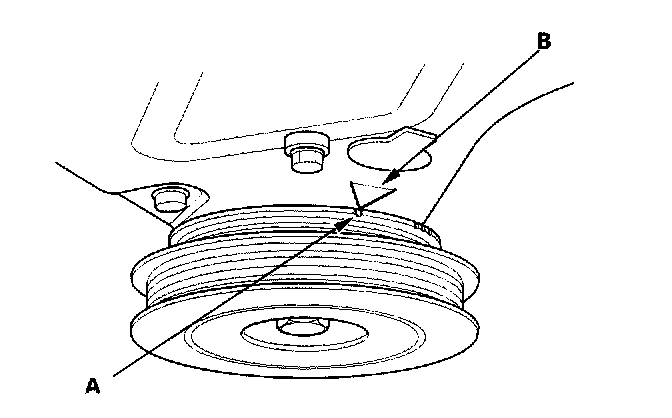 14. Turn the crankshaft pulley so its white mark (A) lines up with the pointer (B).