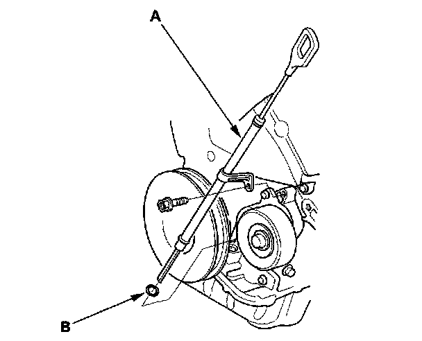 9. Remove the dipstick and tube (A); discard the O-ring (B).