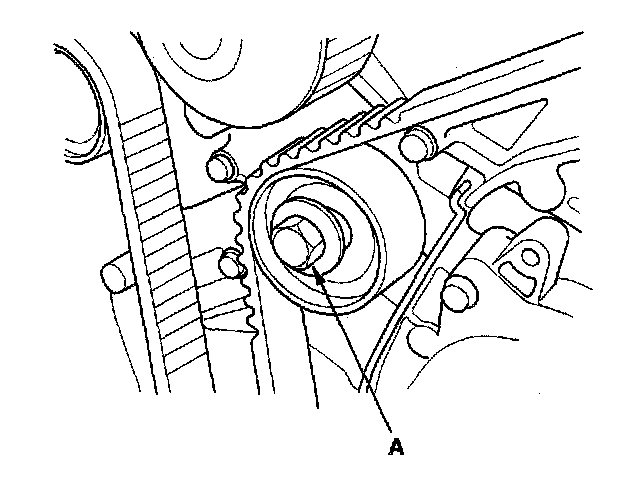 16. Loosen the idler pulley bolt (A) about five or six turns. then remove the timing belt.