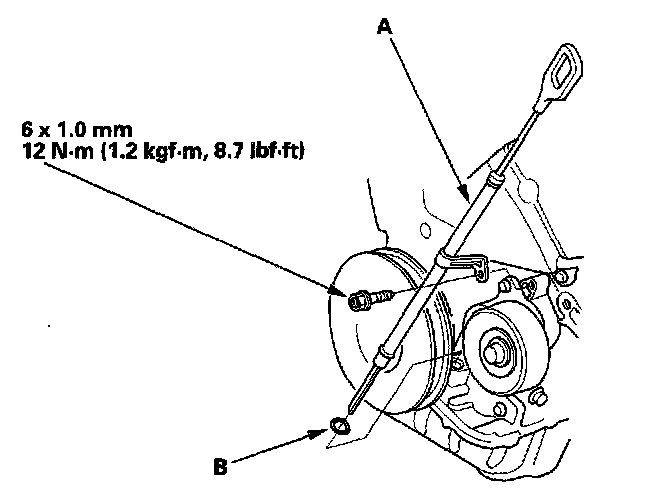 16. Install the dipstick and tube (A) with a new O-ring (B).