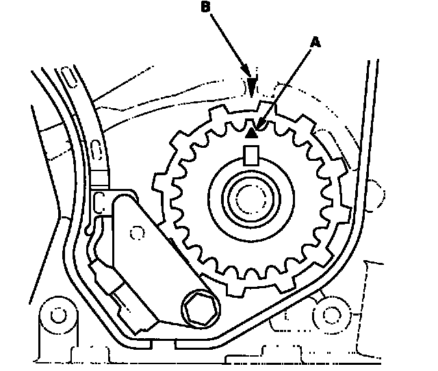 2. Set the timing belt drive pulley to TDC by aligning the TDC mark (A) on the tooth of the timing belt drive pulley with the pointer (B) on the oil pump.