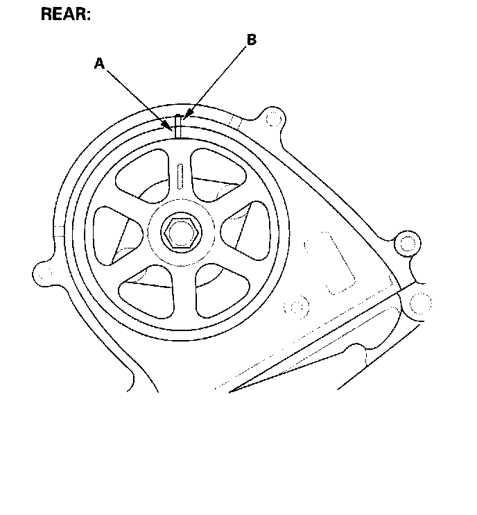 2. Set the timing belt drive pulley to top dead center (TDC) by aligning the TDC mark (A) on the tooth of the timing belt drive pulley with the pointer (B) on the oil pump.