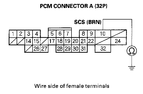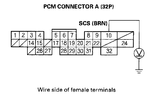 22. Turn the ignition switch OFF, then turn it back ON (II) and measure voltage between PCM connector terminal A10 and body ground.