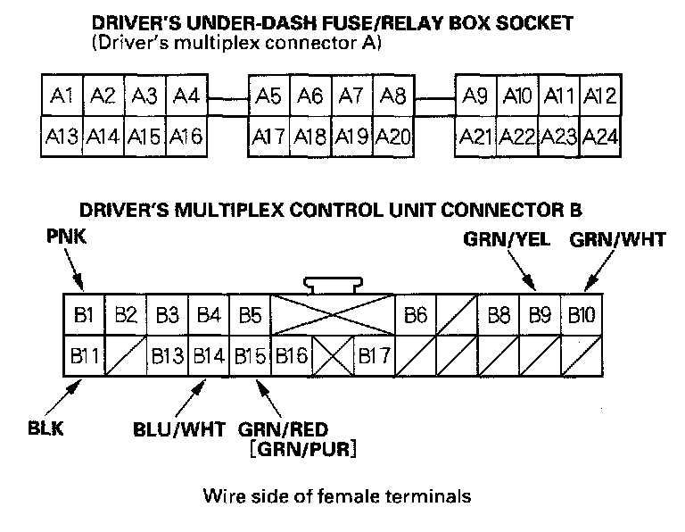 4. With the driver's multiplex control unit still disconnected, make these input tests at the connector and driver's under-dash fuse/relay box sockets.