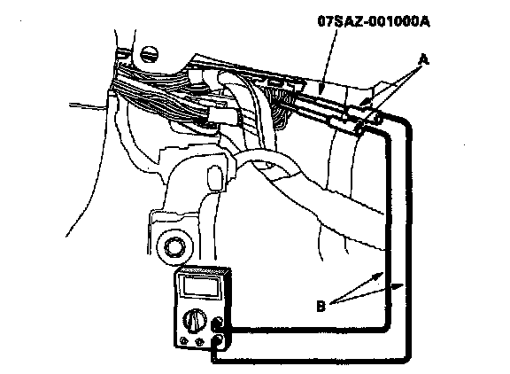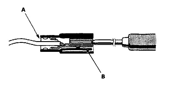 3. If you cannot get to the wire side of the connector or the wire side is sealed (A), disconnect the connector, and probe the terminals (B) from the terminal side. Do not force the probe into the connector.