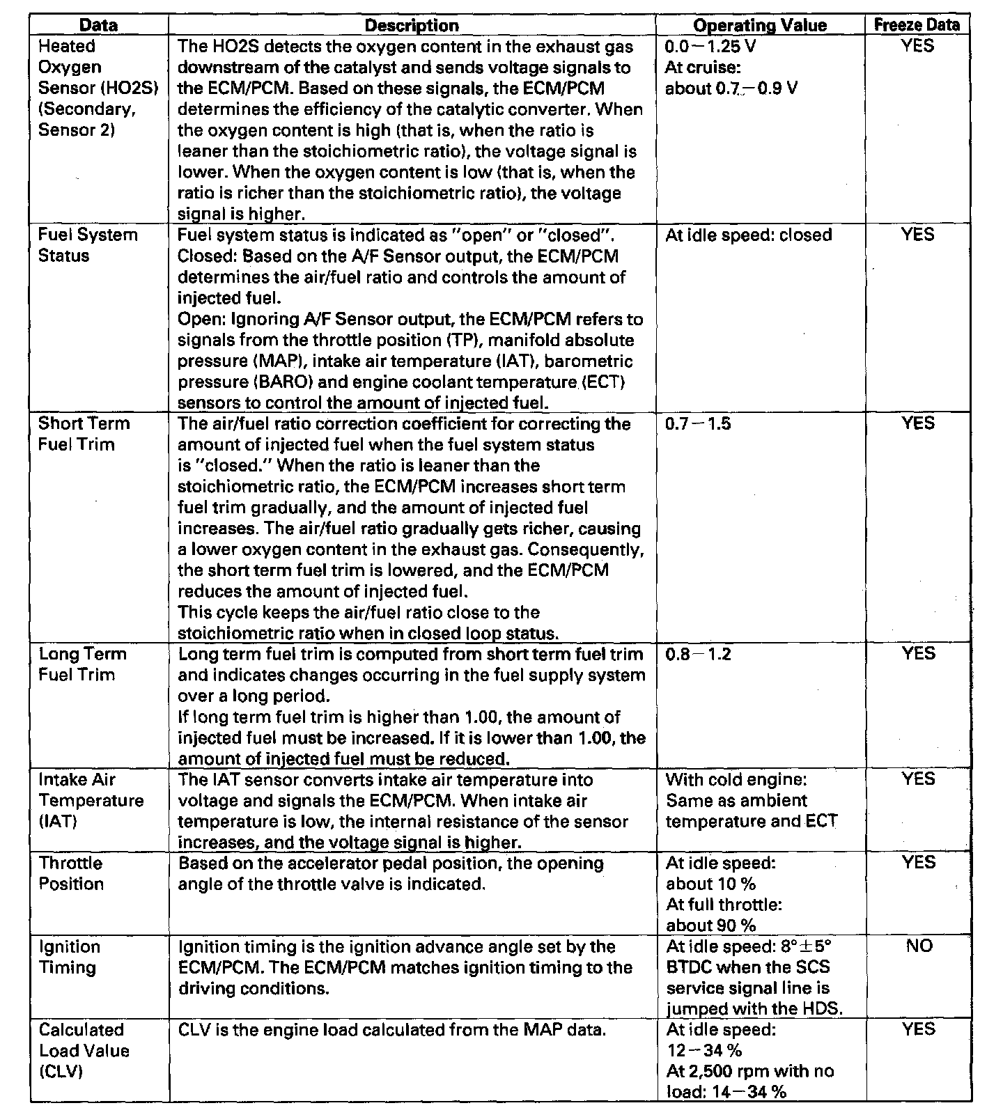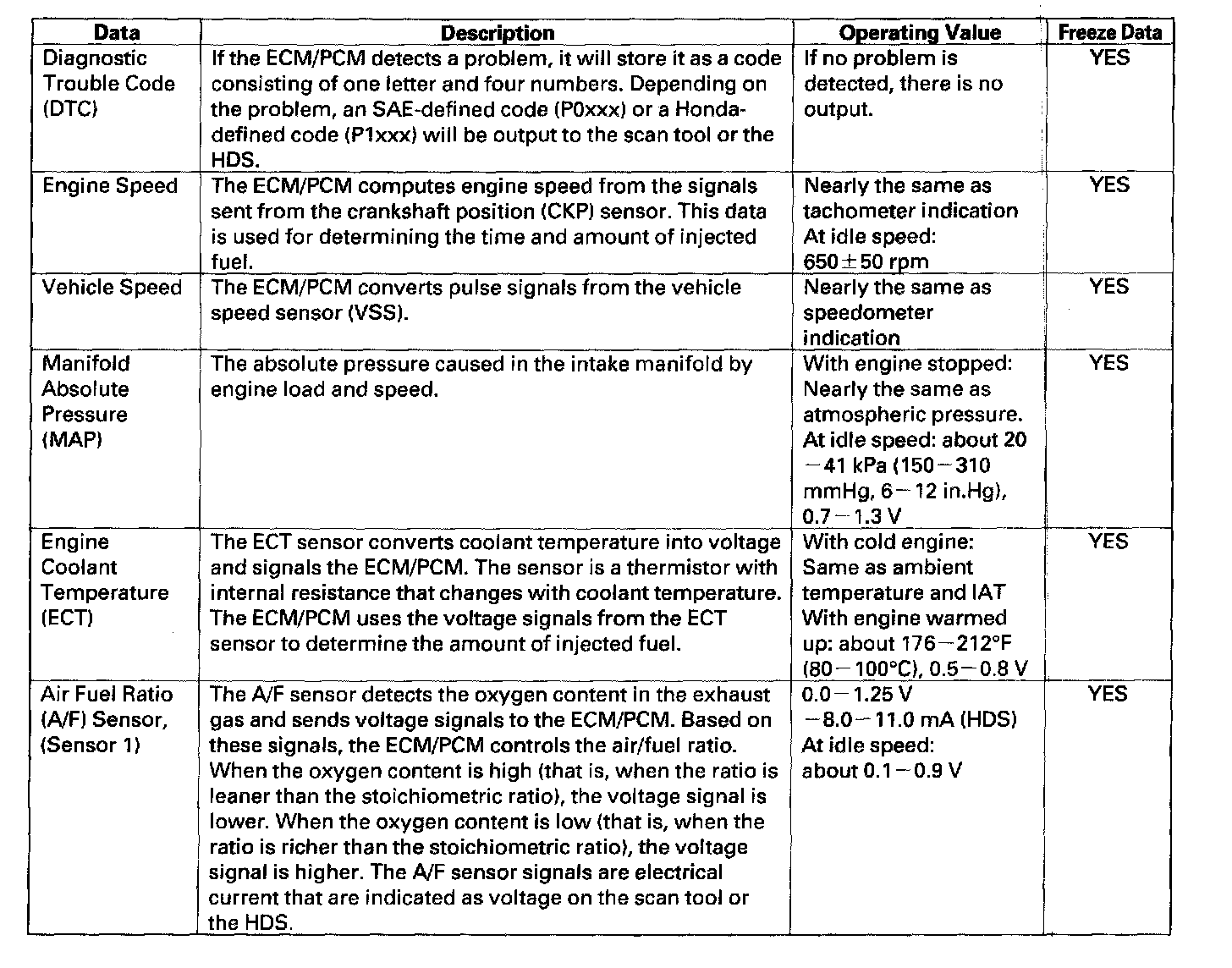 You can retrieve data from the ECM/PCM by connecting the scan tool or the HDS to the data link connector (DLC). The items listed in the table conform to SAE recommended practice. The HDS also reads data beyond that recommended by SAE to help you find the causes of intermittent problems.