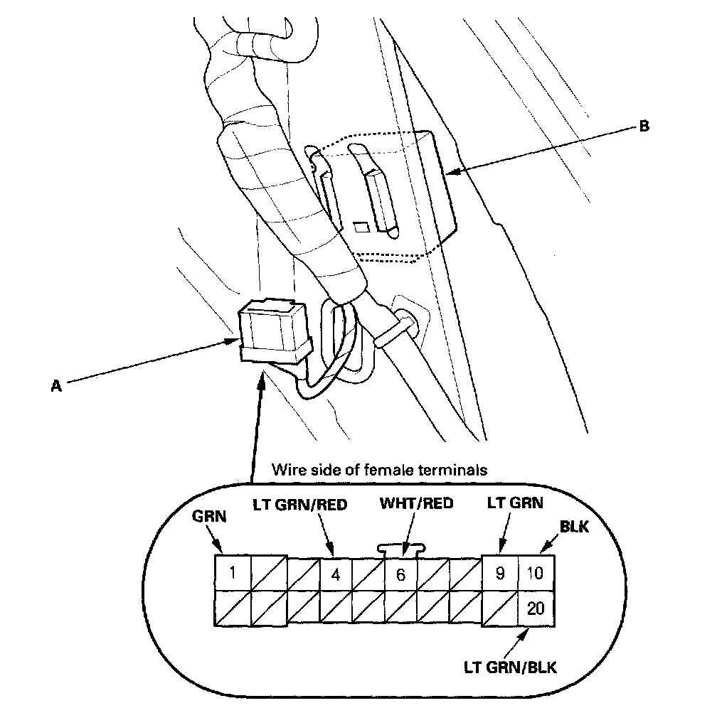 2. Disconnect the 20P connector (A) from the rear window wiper intermittent control unit (B).