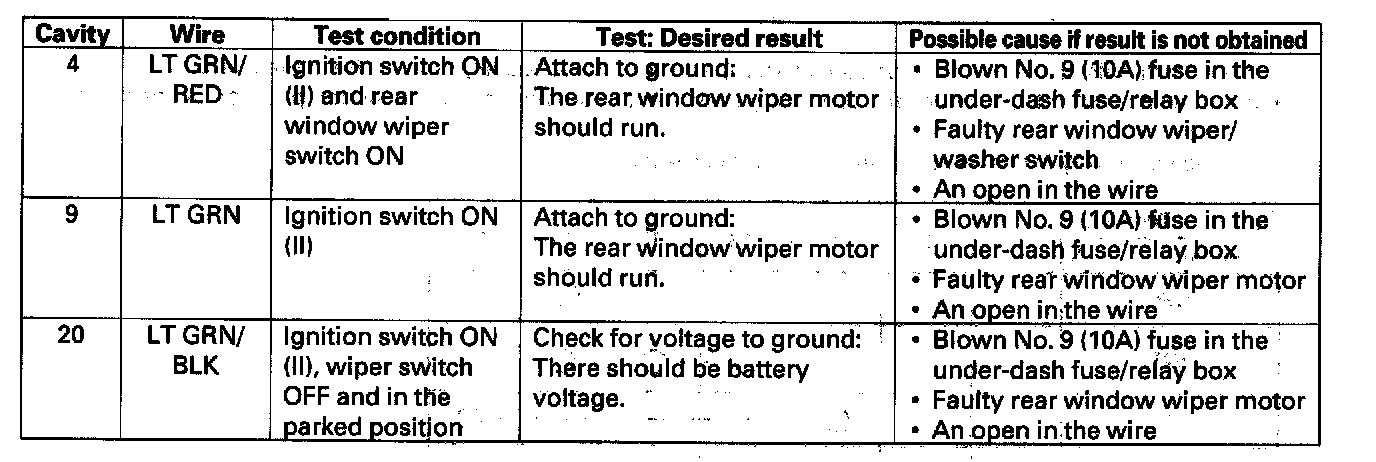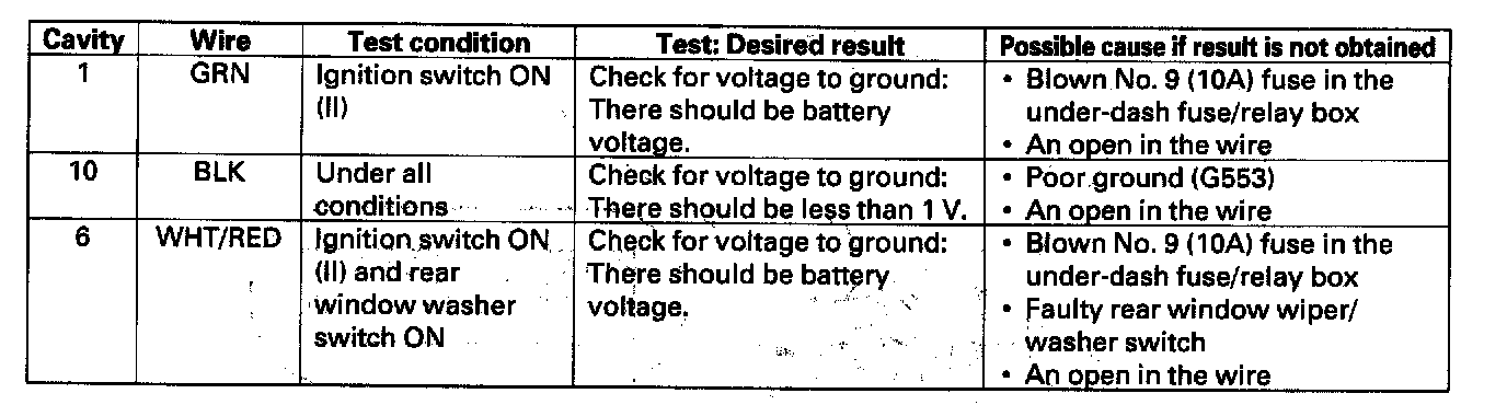 Home >> Honda >> 2004 >> Civic Si L4-2.0L >> Repair and Diagnosis >> Wiper and Washer Systems >> Wiper Control Module >> Testing and Inspection >> Rear Window Wiper Intermittent Control Unit Input Test