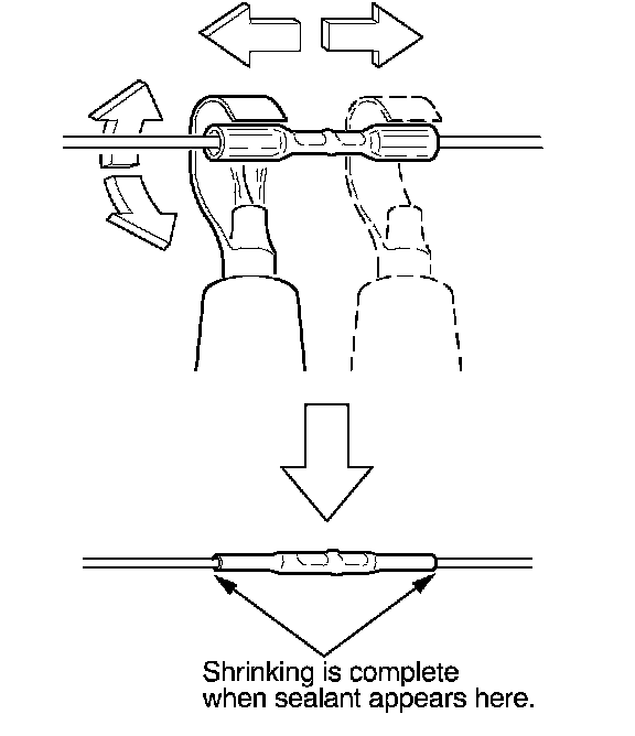 13. Plug in the heat gun, and turn it on. Start at the middle of the splice connector, and move the gun toward the ends as the tube shrinks. Apply heat evenly by rotating the curved heat spreader around the splice connector. Shrinking is complete when a small amount of sealant appears at each end of the tube.