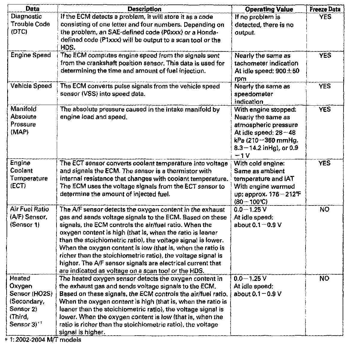 ECM DataYou can retrieve data from the ECM by connecting a scan tool or the HDS to the 16P data link connector (DLC). The items listed in the table shown conform to SAE recommended practice. The HDS also reads data beyond that recommended by SAE. Understanding this data may help you find the causes of intermittent problems.