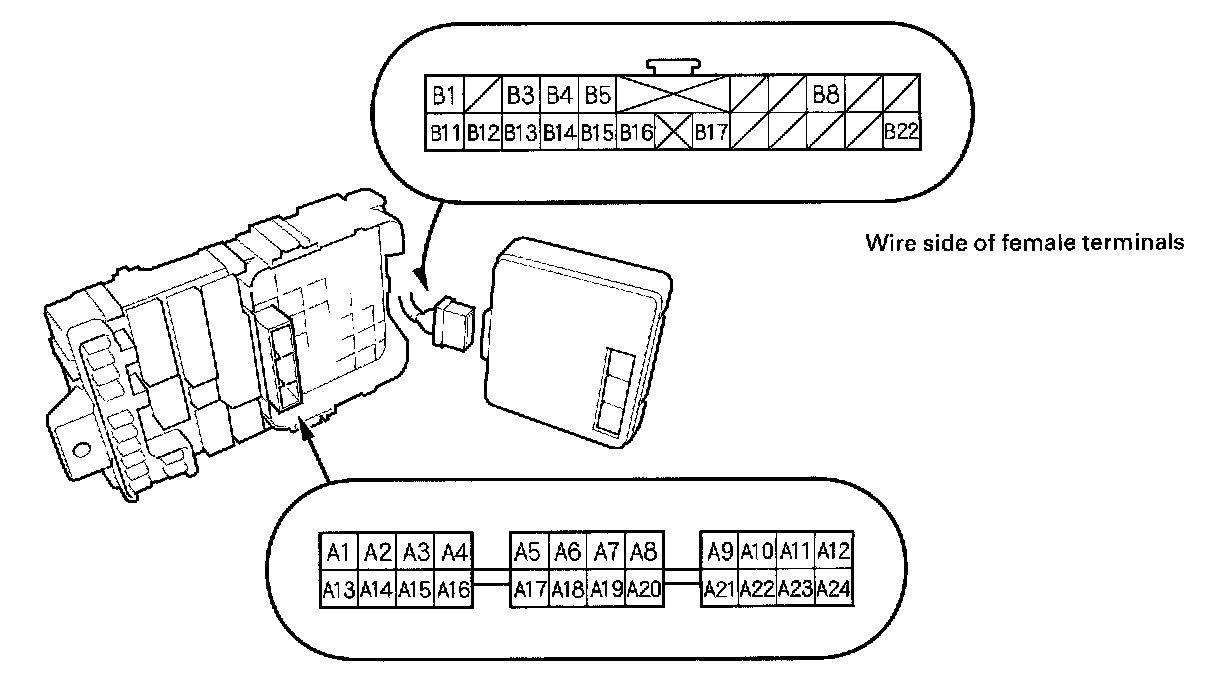 9. Make the following input tests at the connector B and the fuse/relay box socket.