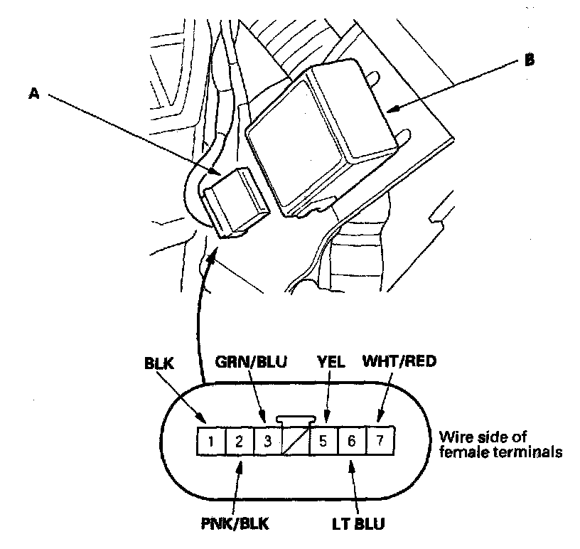 2. Disconnect the 7P connector (A) from the keyless receiver unit (B).