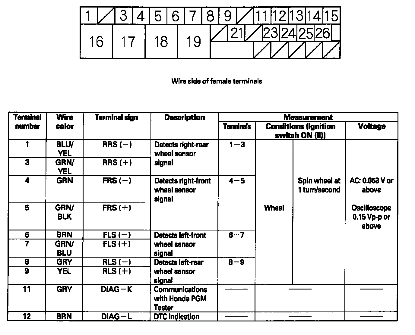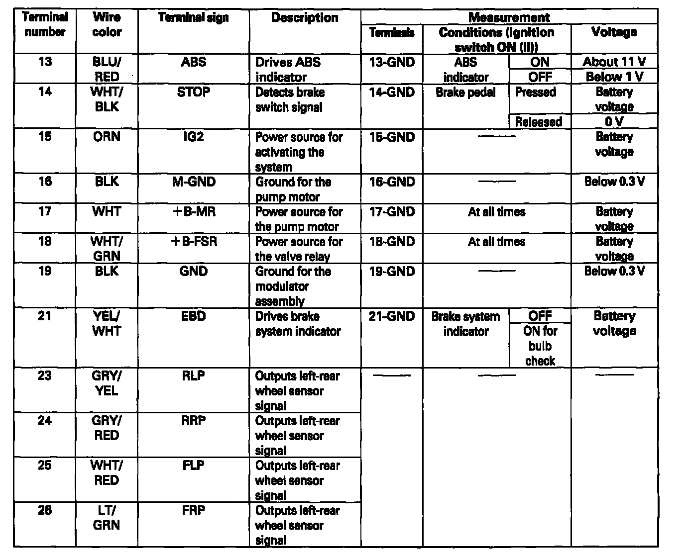 ABS Control Unit Inputs and Outputs for 31P Connector