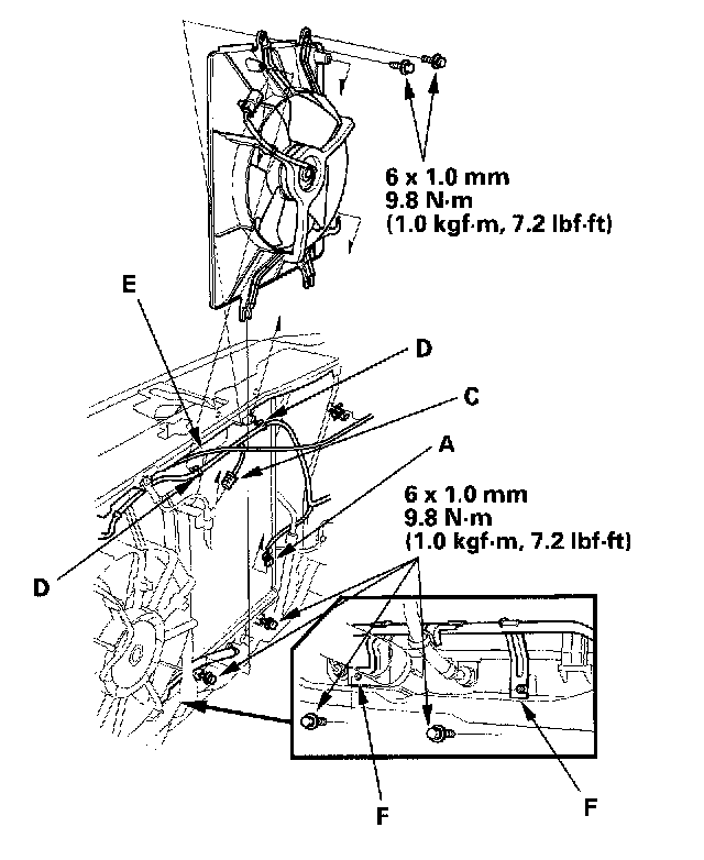 6. Remove the compressor clutch connector (A) from the condenser fan shroud (B), then disconnect the connector Disconnect the condenser fan connector (C), then remove the wire harness clips (D) from the condenser fan shroud. Remove the cruise control actuator cable (E) from the clamp, then remove the bolts from the cooler line brackets (F). Loosen the lower mounting bolts, then remove the upper mounting bolts and the condenser fan shroud. Be careful not to damage the radiator fins when removing the condenser fan shroud.