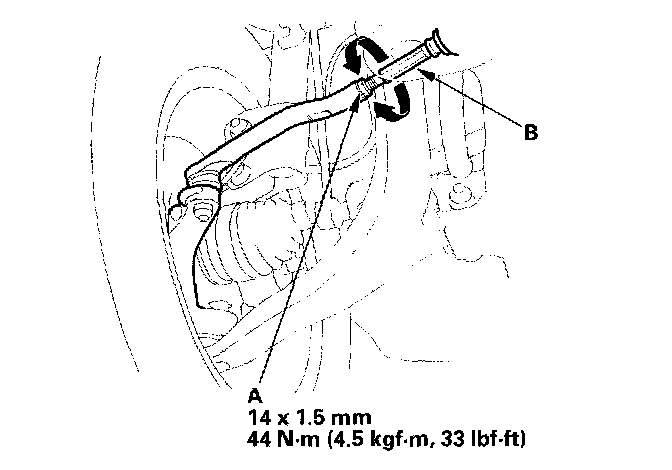 3. Loosen the tie-rod locknuts (A), and turn both tie-rods (B) until the front toe is within specifications.