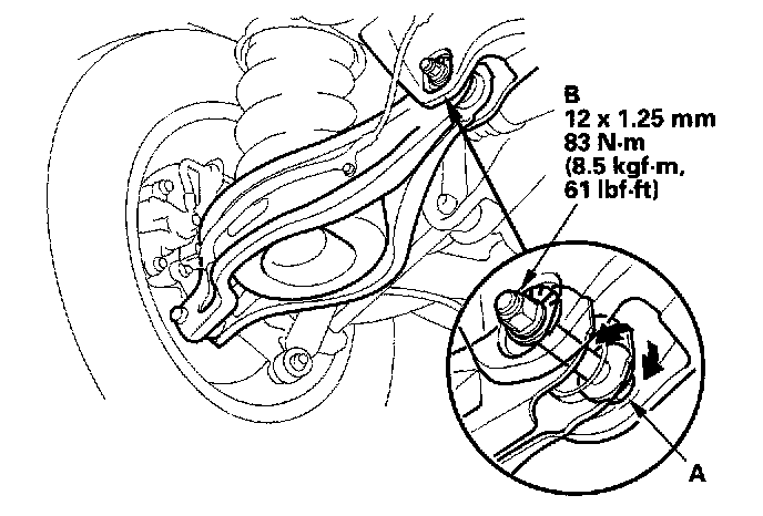 3. Hold the adjusting bolt (A) on the rear lower arm B. and loosen the self-locking nut (B).