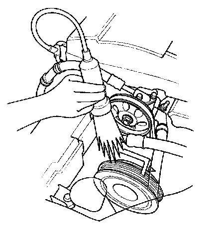 6. Aim the light toward the pointer (A) on the timing belt cover. Check the ignition timing under no load conditions: headlights, blower fan, rear window defogger, and air conditioner are not operating. If the ignition timing differs from the specification, replace the powertrain control module (PCM).