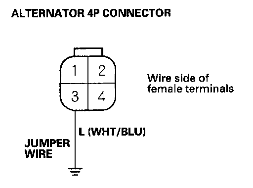 8. Connect the alternator 4P connector terminal No. 3 to body ground with a jumper wire. Turn the ignition switch ON (II).