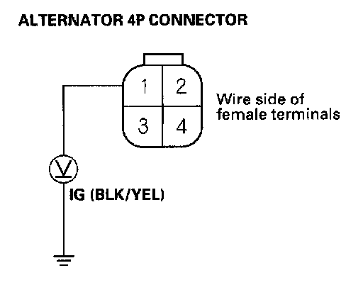 9. Measure the voltage at the No. 1 terminal of the alternator 4P connector with the ignition switch ON (II).
